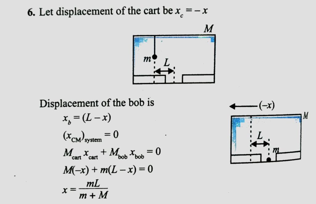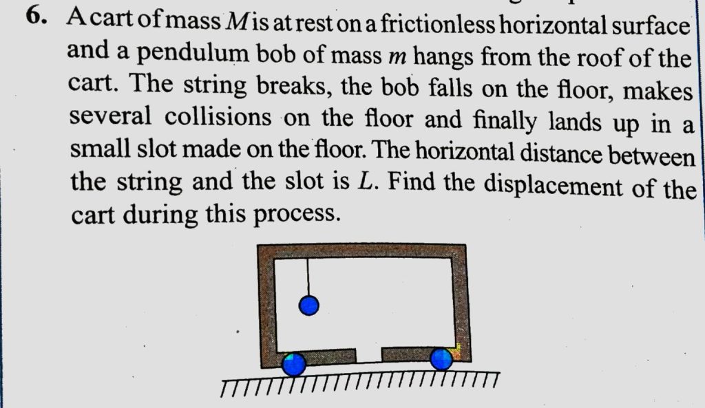 A cart of mass `M` is at rest on a frictionless horizontal surface and a pendulum bob of mass `m` hangs from the roof of the cart. The string breaks, the bob falls on the floor, makes several collisions on the floor and finally lands up in a small slot made on the floor. The horizontal distance between the string and the slot is `L`. Find the displacement of the cart during this process.