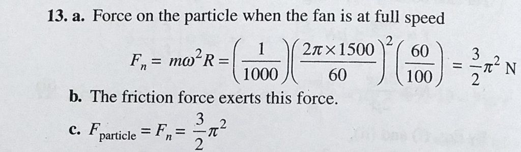 A ceiling fan has a diameter (of the circle through the outer edges of the three blades ) of 120 cm and rpm 1500 at full speed. Consider a particle of mass 1 g sticking at the outer end of the blade. A ceiling fan has a diameter (of the circle through the outer edges of the three blades ) of 120 cm and rpm 1500 at full speed. Consider a particle of mass 1 g sticking at the outer end of the blade. September 30, 2020 Category: Uncategorised (JEE Advanced Physics by BM Sharma + GMP Solutions) , Facebook Messenger WhatsApp Share this:TwitterFacebook Related