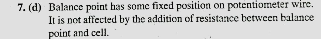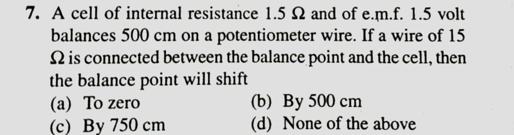 A cell of internal resistance 1.5 ohm and e.m.f. 1.5 volt balances 500 cm on a potentiometer wire. If a wire of 15 ohm is connected between the balance point and the cell, then the balance point will shift A cell of internal resistance 1.5 ohm and e.m.f. 1.5 volt balances 500 cm on a potentiometer wire. If a wire of 15 ohm is connected between the balance point and the cell then the balance point will shift September 20, 2020 Category: Uncategorised (JEE Advanced Physics by BM Sharma + GMP Solutions) , Facebook Messenger WhatsApp Share this:TwitterFacebook Related