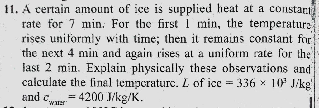 A certain amount of ice is supplied heat at a constant rate for 7 min. For the first 1 min, the temperature rises uniformly with time ; then it remains constant for the next 4 min and again rises A certain amount of ice is supplied heat at a constant rate for 7 min. For the first 1 min the temperature rises uniformly with time ; then it remains constant for the next 4 min and again rises October 23, 2020 Category: Uncategorised (JEE Advanced Physics by BM Sharma + GMP Solutions) , Facebook Messenger WhatsApp Share this:TwitterFacebook Related