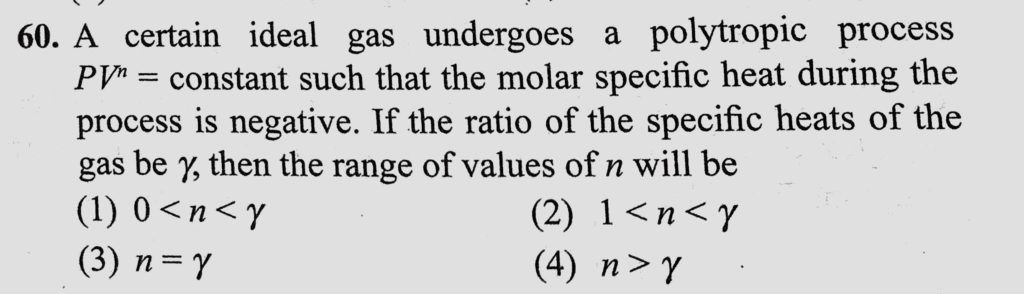 A certain ideal gas undergoes a polytropic process PV^n = constant such that the molar specific heat during the process is negative. If the ratio of the specific heats of the gas A certain ideal gas undergoes a polytropic process PV^n = constant such that the molar specific heat during the process is negative. If the ratio of the specific heats of the gas October 29, 2020 Category: Uncategorised (JEE Advanced Physics by BM Sharma + GMP Solutions) , Facebook Messenger WhatsApp Share this:TwitterFacebook Related