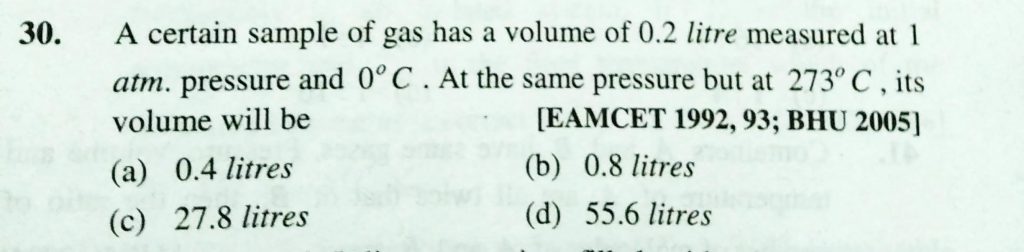 A certain sample of gas has a volume of 0.2 litre measured at 1 atm. pressure and 0 degree C. At the same pressure but at 273 degree C , its volume will be (a) 4 L (b) 0.8 L (c) 27.8 L (d) 55.6 L A certain sample of gas has a volume of 0.2 litre measured at 1 atm. pressure and 0 degree C. At the same pressure but at 273 degree C its volume will be (a) 4 L (b) 0.8 L (c) 27.8 L (d) 55.6 L February 10, 2021 Category: Uncategorised (JEE Advanced Physics by BM Sharma + GMP Solutions) , Facebook Messenger WhatsApp Share this:TwitterFacebook Related