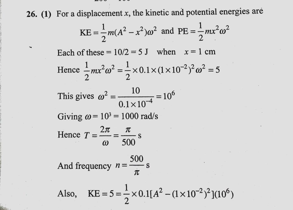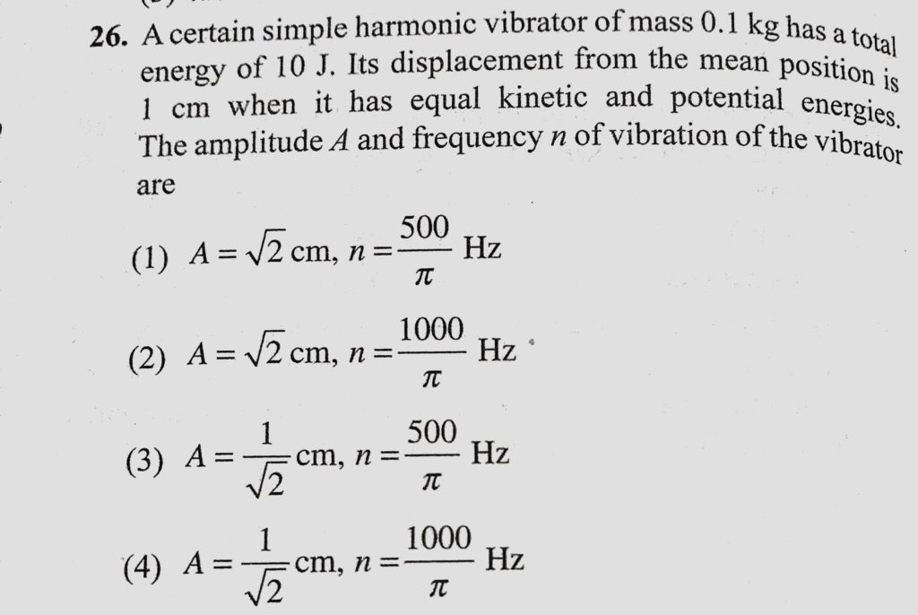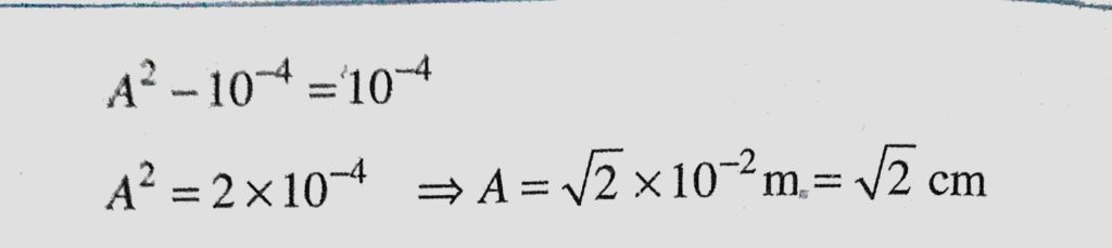 A certain simple harmonic vibrator of mass 0.1 kg has a total energy of 10 J. Its displacement from the mean position is 1 cm when it has equal kinetic and potential energies. The amplitude A certain simple harmonic vibrator of mass 0.1 kg has a total energy of 10 J. Its displacement from the mean position is 1 cm when it has equal kinetic and potential energies. The amplitude October 30, 2020 Category: Uncategorised (JEE Advanced Physics by BM Sharma + GMP Solutions) , Facebook Messenger WhatsApp Share this:TwitterFacebook Related