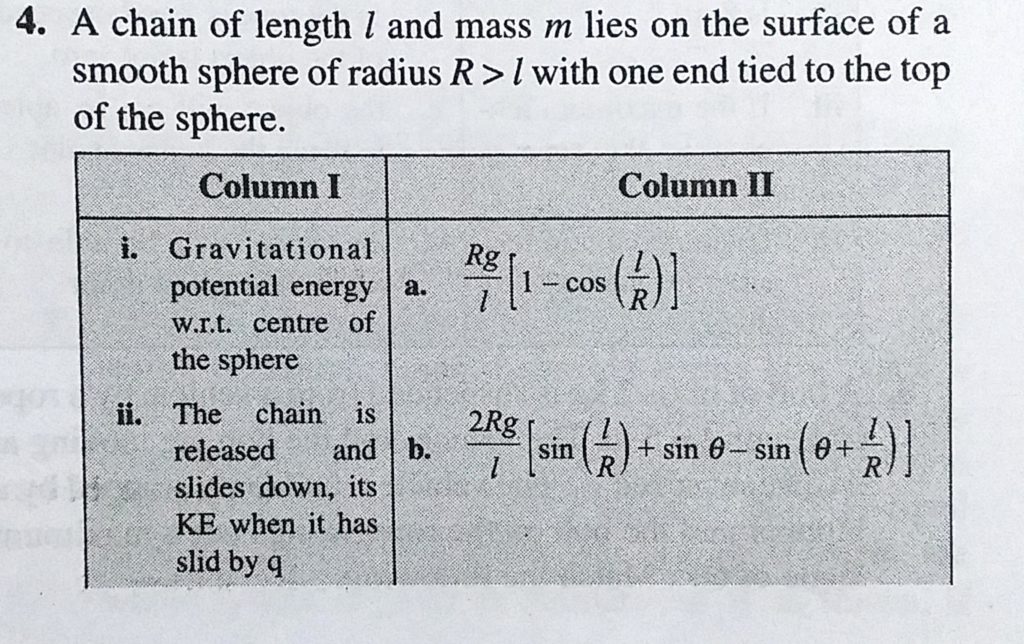 A chain of length l and mass m lies on the surface of a smooth sphere of radius R > l with one end tied to the top of the sphere. A chain of length l and mass m lies on the surface of a smooth sphere of radius R > l with one end tied to the top of the sphere. October 4, 2020 Category: Uncategorised (JEE Advanced Physics by BM Sharma + GMP Solutions) , Facebook Messenger WhatsApp Share this:TwitterFacebook Related