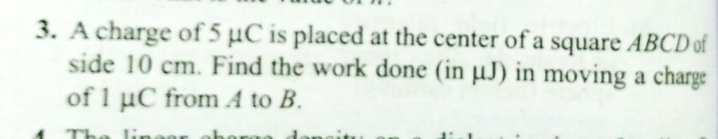 A charge of 5 muC i splaced at the center of a square ABCD of side 10 cm. Find the work done ( in muJ ) in moving a charge of 1 muC from A to B . A charge of 5 muC i splaced at the center of a square ABCD of side 10 cm. Find the work done ( in muJ ) in moving a charge of 1 muC from A to B . November 6, 2020 Category: Uncategorised (JEE Advanced Physics by BM Sharma + GMP Solutions) , Facebook Messenger WhatsApp Share this:TwitterFacebook Related