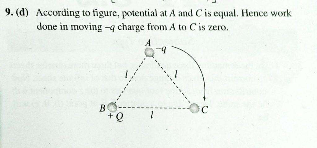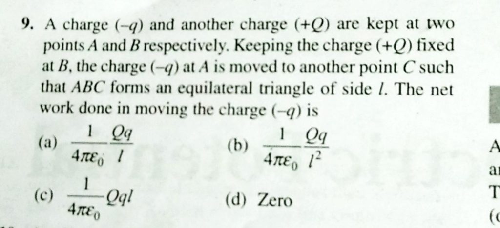 A charge -q and another chage +q are kept at two points A and B respec tively. keeping the charge +Q fixed at B, the charge -q at A is moved to another point C such that ABC forms an equilateral triangle of side l. The net work done in moving the charge -q is