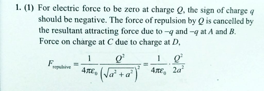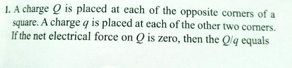 A charge Q is placed at each of the opposite corners of a square. A charge q is placed at other two corners. If the net electrical force on Q is zero, then the Q/q equals A charge Q is placed at each of the opposite corners of a square. A charge q is placed at other two corners. If the net electrical force on Q is zero then the Q/q equals October 30, 2020 Category: Uncategorised (JEE Advanced Physics by BM Sharma + GMP Solutions) , Facebook Messenger WhatsApp Share this:TwitterFacebook Related