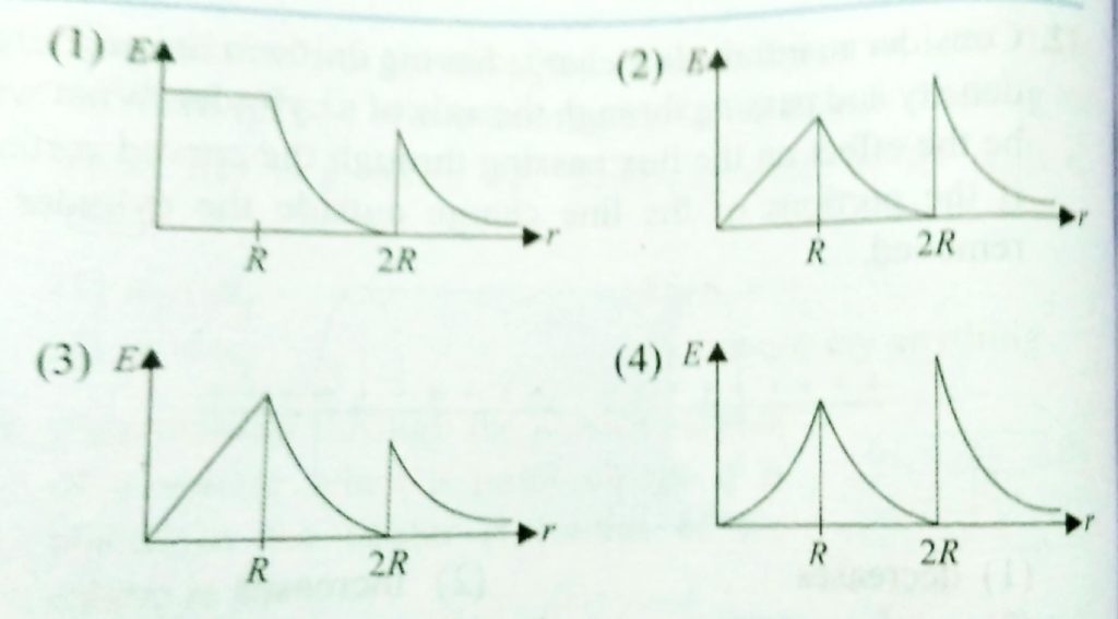 A charge Q is uniformly distributed in a dielectric sphere of radius R (having dielectric constant unity). This dielectric sphere is enclosed by a concentric spherical shell of radius 2R and having uniformly distributed charge 2Q. Which of the following graph correctly represents variation of electric field with distance r from the common centre?