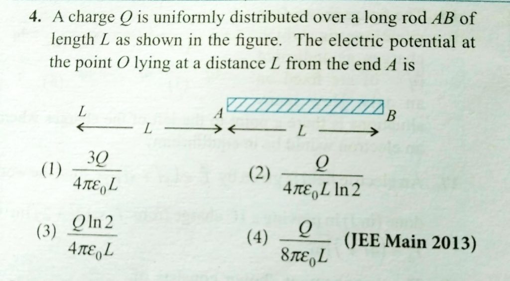 A charge Q is uniformly distributed over a long rod AB of elngth L as shown in the figure. The electric potential at the point O lying at a distance L from the end A is A charge Q is uniformly distributed over a long rod AB of elngth L as shown in the figure. The electric potential at the point O lying at a distance L from the end A is November 6, 2020 Category: Uncategorised (JEE Advanced Physics by BM Sharma + GMP Solutions) , Facebook Messenger WhatsApp Share this:TwitterFacebook Related
