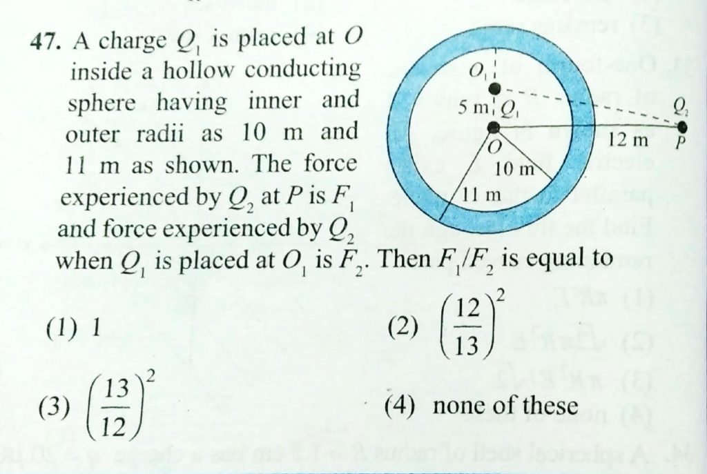 A charge Q1 is placed at O inside a hollow conducting sphere having inner and outer radii as 10 m and 11 m as shown. The force experienced by Q2 at P is F1 and Force experienced by Q2 when Q1 is placed at O1 is F2. Then F1/F2 is equal to are separated by a distance d. Now each of area A the left plate is given a positive charge Q. A positive charge q of mass m is released from a point near the left plate. Find the time taken by the charge to reach the right plate. Two parallel conducting plates November 1, 2020 Category: Uncategorised (JEE Advanced Physics by BM Sharma + GMP Solutions) , Facebook Messenger WhatsApp Share this:TwitterFacebook Related