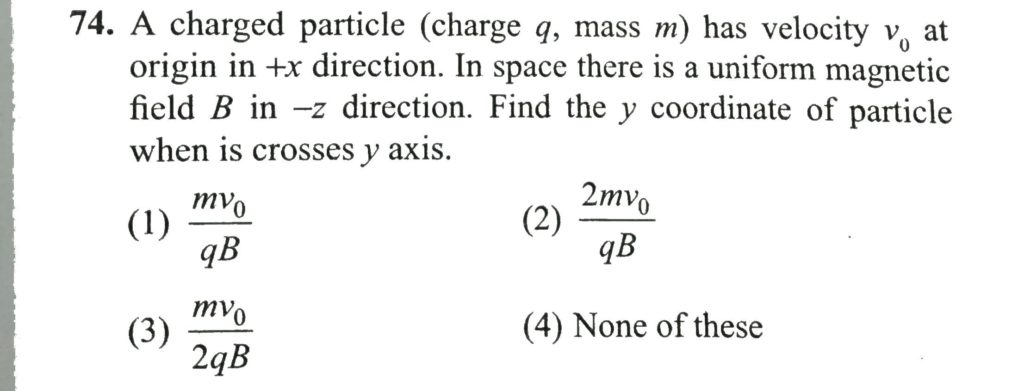 A charged particle (charge q, mass m) has velocity v0 at origin in +x direction. In space there is a uniform magnetic field B in -z direction. Find the y coordinate of particle when is crosses y axis. A charged particle (charge q mass m) has velocity v0 at origin in +x direction. In space there is a uniform magnetic field B in -z direction. Find the y coordinate of particle when is crosses y axis. October 14, 2020 Category: Uncategorised (JEE Advanced Physics by BM Sharma + GMP Solutions) , Facebook Messenger WhatsApp Share this:TwitterFacebook Related