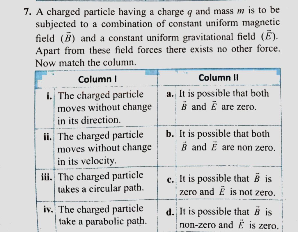 A charged particle having a charge q and mass m is to be subjected to a combination of constant uniform magnetic field ( B ) and a constant uniform fravitational field ( E ) . Apart from these field forces there exists no other force. Now match the column.