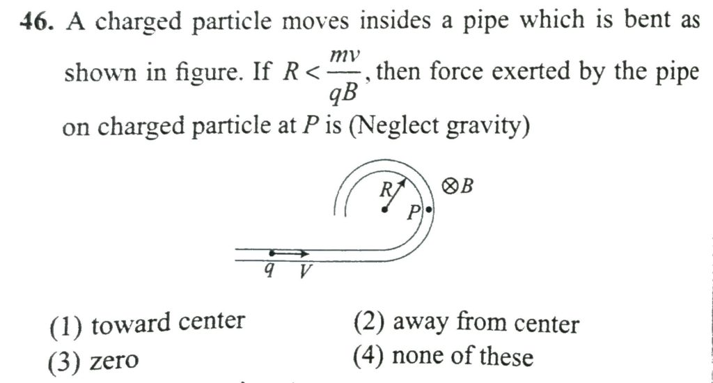A charged particle moves insides a pipe which is bent as shown in Fig. 1.151. If R<mv/qB , then force exerted by the pipe on charged particle at P is (Neglect gravity) A charged particle moves insides a pipe which is bent as shown in Fig. 1.151. If R<mv/qB then force exerted by the pipe on charged particle at P is (Neglect gravity) October 13, 2020 Category: Uncategorised (JEE Advanced Physics by BM Sharma + GMP Solutions) , Facebook Messenger WhatsApp Share this:TwitterFacebook Related