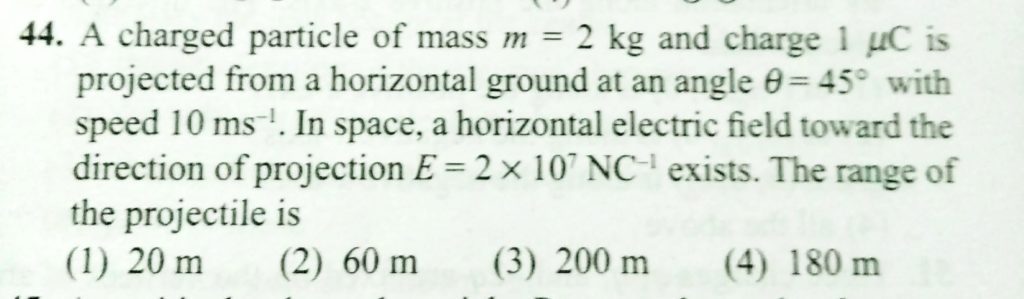 A charged particle of mass m = 2 kg and charge 1 μC is projected from a horizontal ground at an angle θ=45∘ with speed 10ms−1. In space, a horizontal electric field towards the direction of projection E = 2×10^7 N/C exists. The range of the projectile is