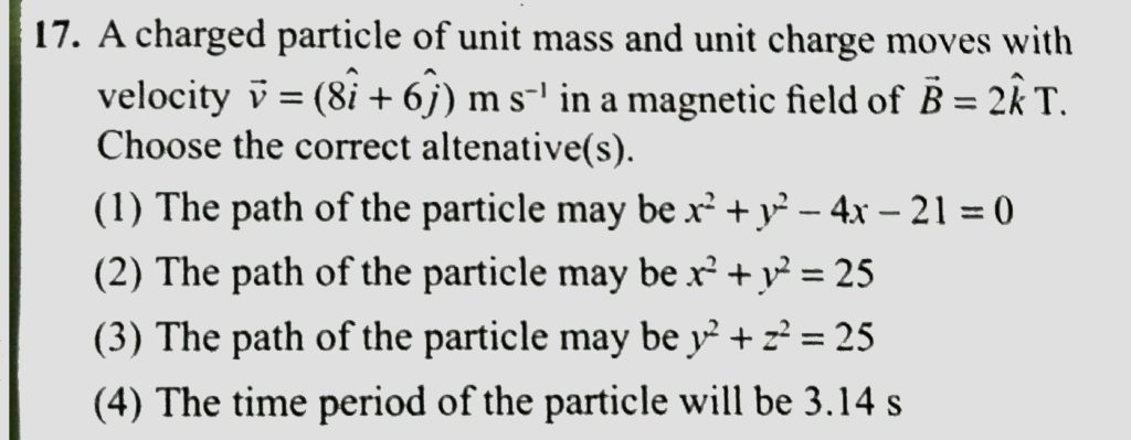 A charged particle of unit mass and unit charge moves with velocity v = (8 i + 6 j ) m/s in a magnetic field of B = 2 kT. Choose the correct alternatives. A charged particle of unit mass and unit charge moves with velocity v = (8 i + 6 j ) m/s in a magnetic field of B = 2 kT. Choose the correct alternatives. October 14, 2020 Category: Uncategorised (JEE Advanced Physics by BM Sharma + GMP Solutions) , Facebook Messenger WhatsApp Share this:TwitterFacebook Related