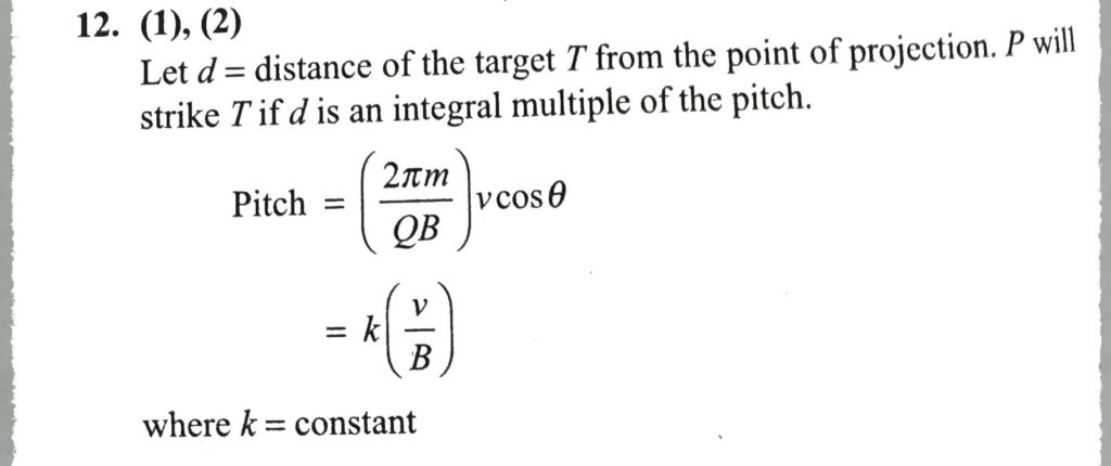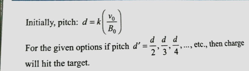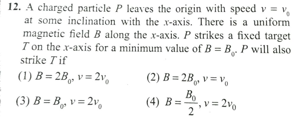 A charged particle P leaves the origin with speed v = v0 at some inclination with the x – axis. There is a uniform magnetic field B along the x – axis . P strikes a fixed target T on the x – axis for a minimum value of B = B0. P will also strike T if