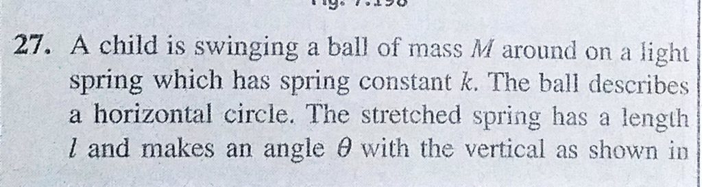 A child is swinging a ball of mass M around on a light spring which has spring constant k. The ball describes a horizontal circle. The stretched spring has a length l and makes an angle theta with the vertical A car is moving with uniform speed over a circular bridge of radius R which subtends an angle of 90 at its center. Find the minimum possible speed so that the car can cross the bridge September 30, 2020 Category: Uncategorised (JEE Advanced Physics by BM Sharma + GMP Solutions) , Facebook Messenger WhatsApp Share this:TwitterFacebook Related