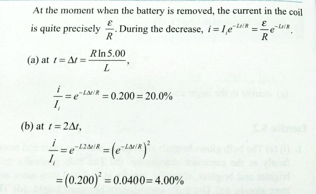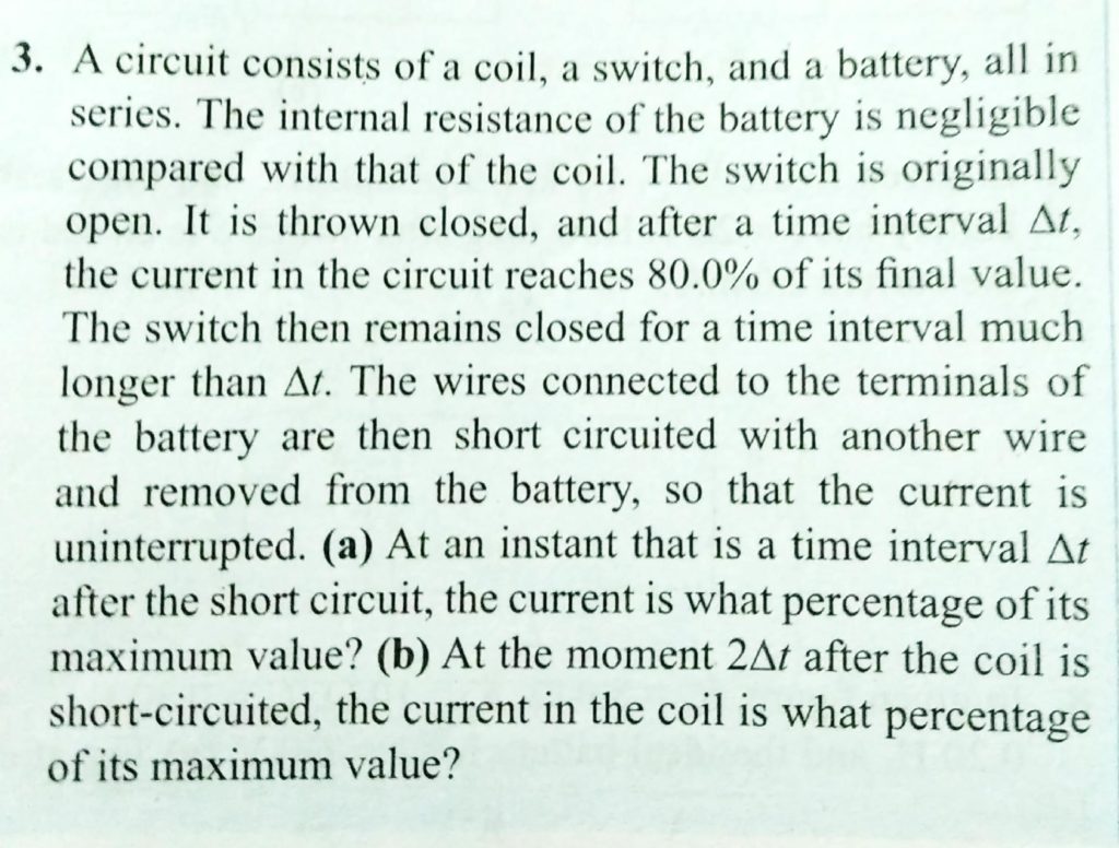 A circuit consists of a coil, a switch and a battery, all in series. The interval resistance of the battery is negligible compared with that of the coil. The switch is originally open. It is thrown closed, after a time interval Δt. The current in the circuit reaches 80.0% of its final value. The switch then remains closed for a time interval much longer than Δt. The wires connected to the terminals of the battery are then short circuited with another wire and removed from the battery, so that the current is uninterrupted. At the moment 2Δt after the coil is short-circuited, the current in the coil is what percentage of its maximum value?