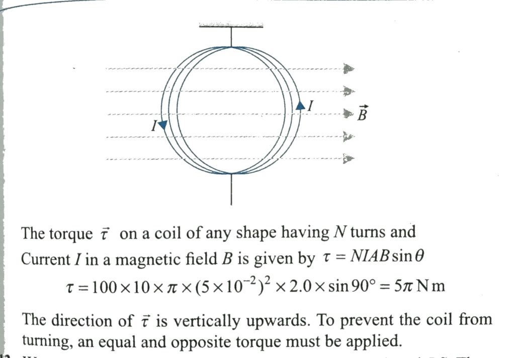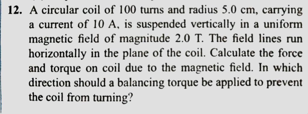 A circular coil of 100 turns and having an effective radius of 5 cm carries a current of 10 ampere, is suspended vertically in a uniform magnetic field of magnitude 2.0 T. The field lines run horizontally in the plane of the coil. calculate the force and torque on coil due to the magnetic field. In which direction should a balancing torque be applied to prevent the coil from turning?