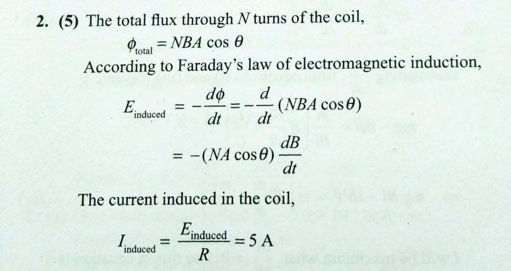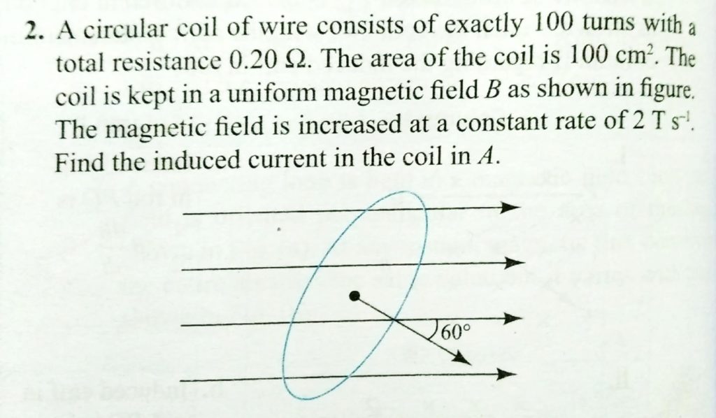 A circular coil of wire consits of exactly 100 turns with a total resistance 20 ohm. THe area of the coil is 100 cm^2. the coil is kept in a uniform magnetic field B as shown in figure. THe magnetic field is increased at a constant rate of 2 T/s. Find the induced current in the coil in A.