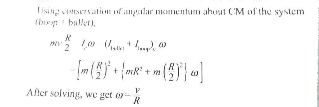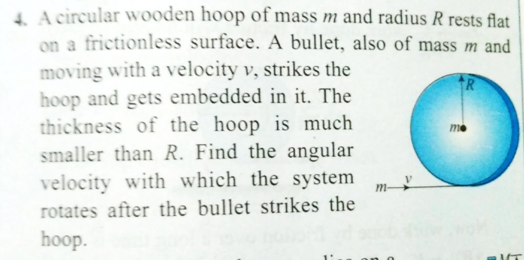 A circular hoop of mass m and radius R rests flat on a horizontal frictionless surface. A bullet, also a mass m and moving with velocity v, strikes the hoop and gets embedded in it. The thickness of the hoop is much smaller than R. The angular velocity with which the system rotates after the bullet strikes the hoop is: