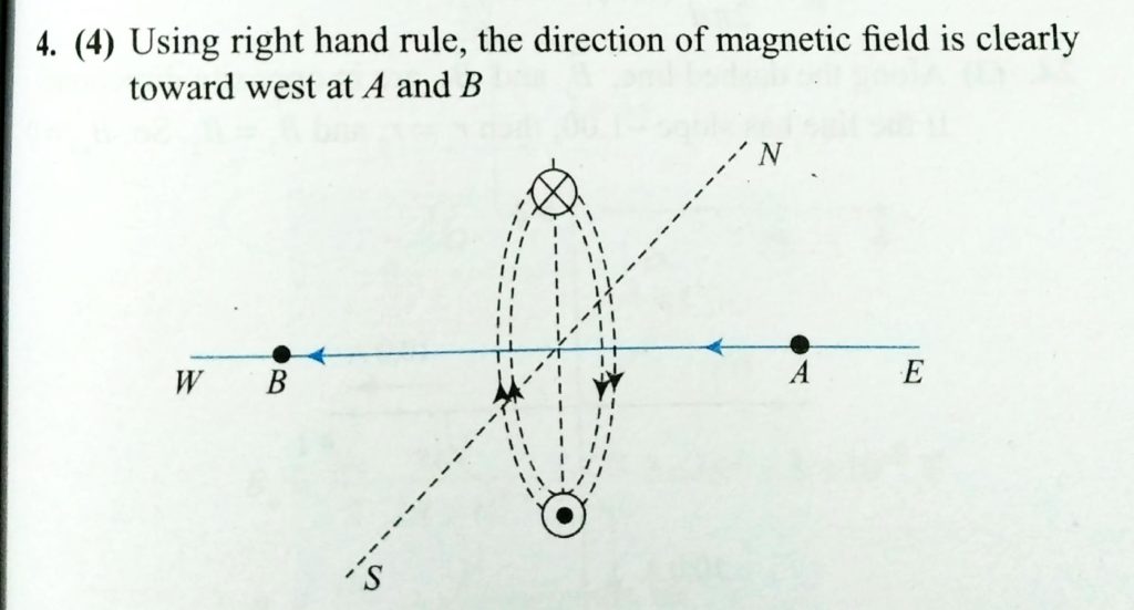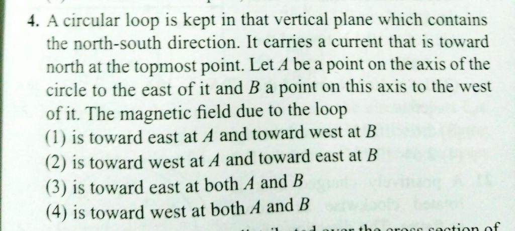 A circular loop is kept in that vertical plane which contains the north- south direction. It carries a current that is towards north at the topmost point. Let A be a point on the axis of the circle to the east of it and B a point on this axis to the west of it. The magnetic field due to the loop.