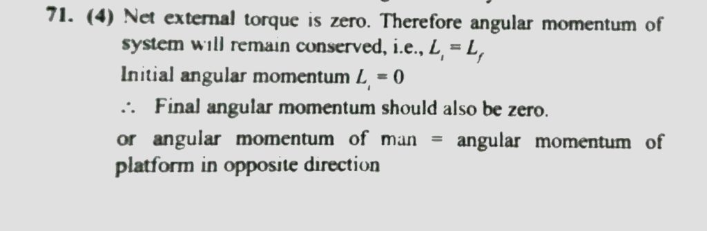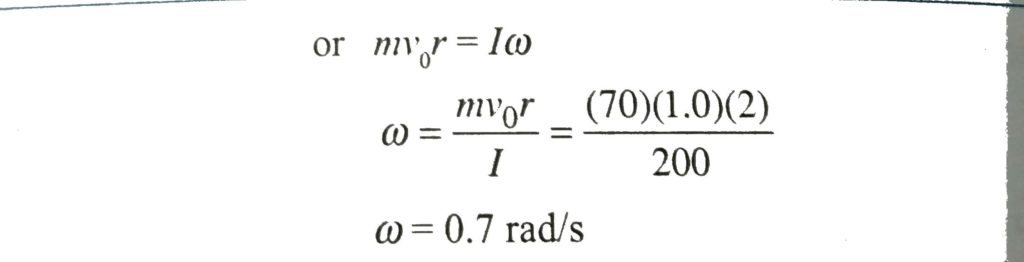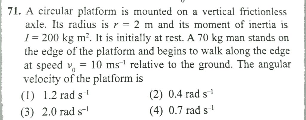 A circular platform is mounted on a vertical frictionless axle. Its radius r = 2 m and its moment of interia is I = 200 kg m^2. It is initially at rest. A 70 kg man stands on the edge at speed v0 = 10 m/s relative to the ground. The angular velocity of the platform is