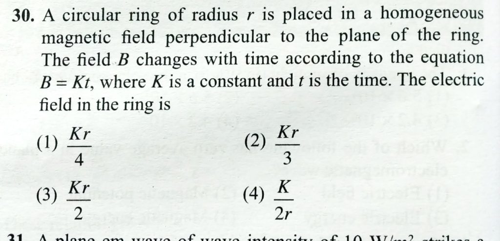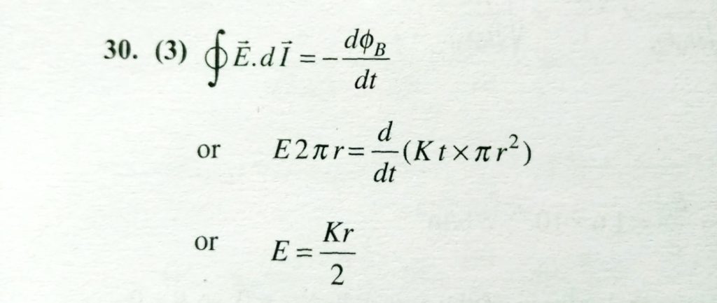 A circular ring of radius r is placed in a homogeneous magnetic field perendicular to the plane of the ring. The field B changes with time according to the equation B=kt where K is constant and r is the time. The electric field in the ring is: The wave of wavelength 5900 A emitted by any atom or molecule must have some finite total length which known as coherence length. For sodium light this length is 2.4 cm. The number of oscillation in this length will be October 29, 2020 Category: Uncategorised (JEE Advanced Physics by BM Sharma + GMP Solutions) , Facebook Messenger WhatsApp Share this:TwitterFacebook Related
