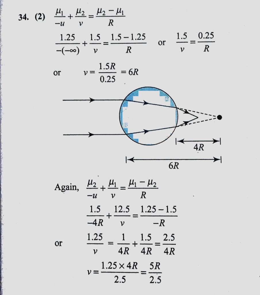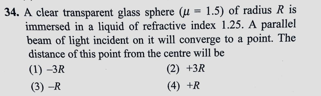 A clear transparent glass sphere (mu = 1.5) of radius R is immersed in a liquid of refractive index 1.25. A parallel beam of light incident on it will converge to a point. The distance of this point from the centre will be An object is placed at a distance of 25 cm from the pole of a convex mirror and a plane mirror is set at a distance 5 cm from convex mirror so that the virtual images formed by the two mirrors don not October 6, 2020 Category: Uncategorised (JEE Advanced Physics by BM Sharma + GMP Solutions) , Facebook Messenger WhatsApp Share this:TwitterFacebook Related