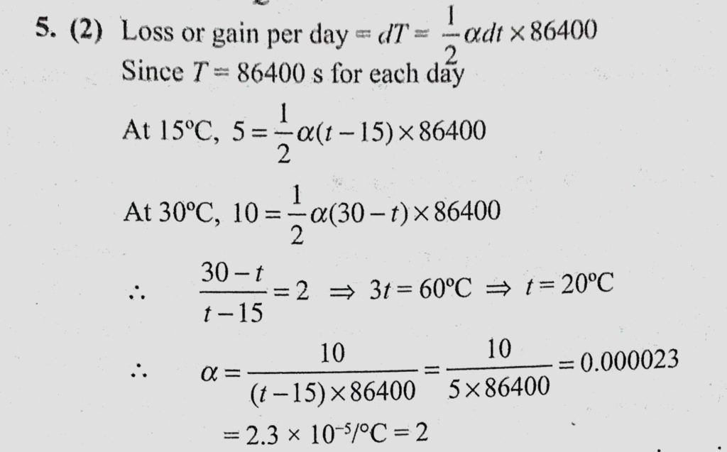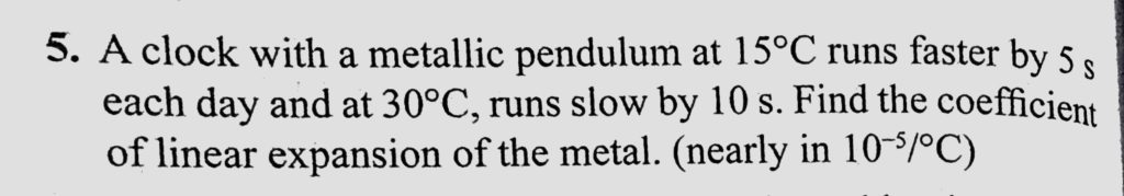 A clock with a metallic pendulum at 15 C runs faster by 5 s each day and at 30 C, runs slow by 10 s. Find the coefficient of linear expansion of the metal. A clock with a metallic pendulum at 15 C runs faster by 5 s each day and at 30 C runs slow by 10 s. Find the coefficient of linear expansion of the metal. October 24, 2020 Category: Uncategorised (JEE Advanced Physics by BM Sharma + GMP Solutions) , Facebook Messenger WhatsApp Share this:TwitterFacebook Related