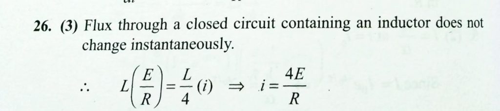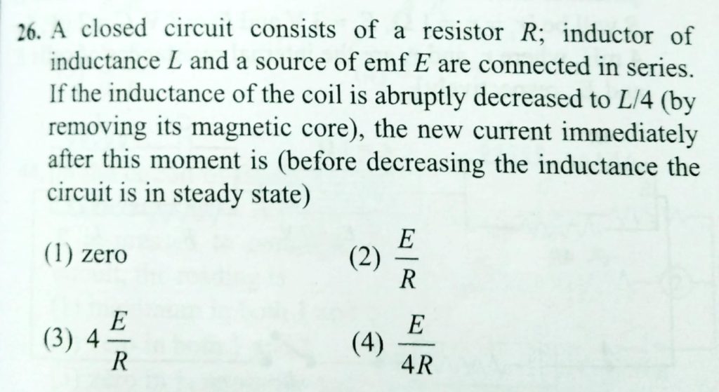 A closed circuit of a resistor R, inductor of inductance L and a source of emf E are connected is series. If the inductance of the coil is abruptly decreaed to L/4 (by removing its magnetic core), the new current immediately after this moment is (before decreasing the inductance the circuit is in steady state)