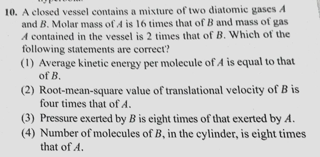 A closed vessel contains a mixture of two diatomic gases A and B. Molar mass of A is 16 times that of B and mass of gas A contained in the vessel is 2 times that of B. Which of the following A closed vessel contains a mixture of two diatomic gases A and B. Molar mass of A is 16 times that of B and mass of gas A contained in the vessel is 2 times that of B. Which of the following October 28, 2020 Category: Uncategorised (JEE Advanced Physics by BM Sharma + GMP Solutions) , Facebook Messenger WhatsApp Share this:TwitterFacebook Related