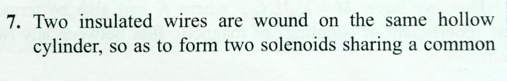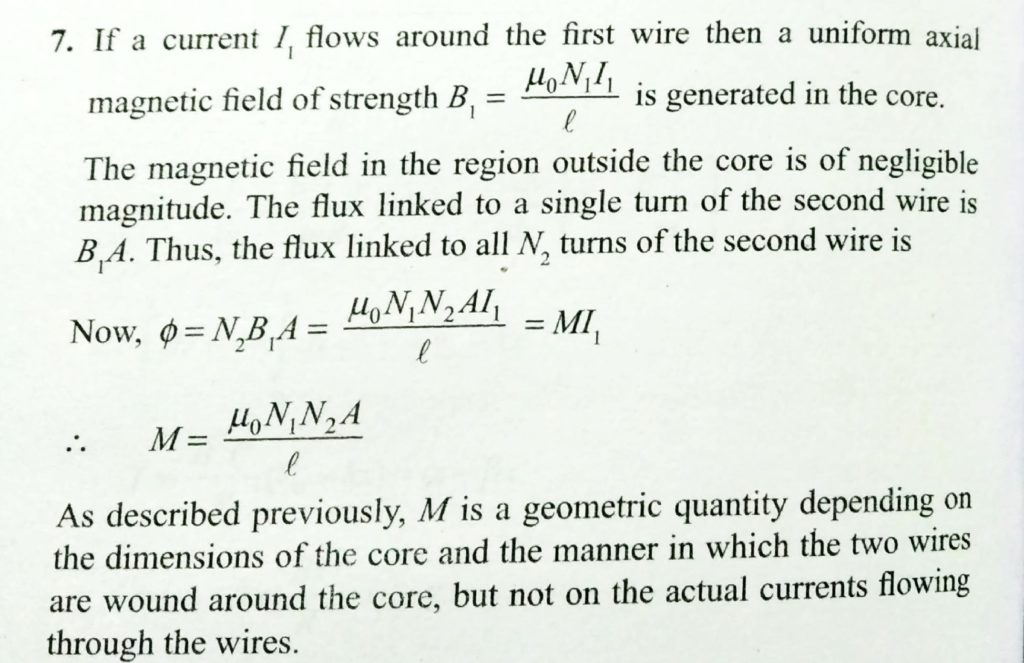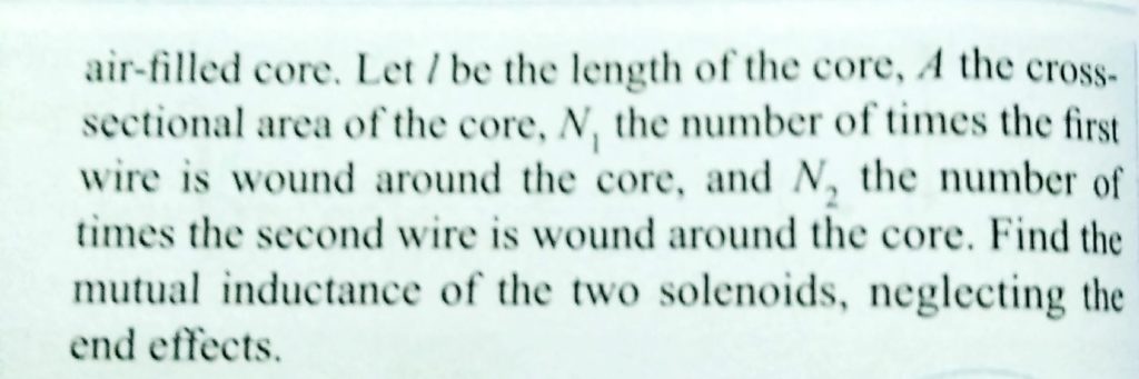 Two insulated wires are wound on the same hollow cylinder so as to form two solenoids sharing a common air-filled core. Let l be the length of the core, A the cross -sectional area of the core, N1 the number of times the first wire is wound around the core, and N2 the number of times the second wire is wound around the core. Find the mutual inductance of the two solenoids, neglecting the end effects.