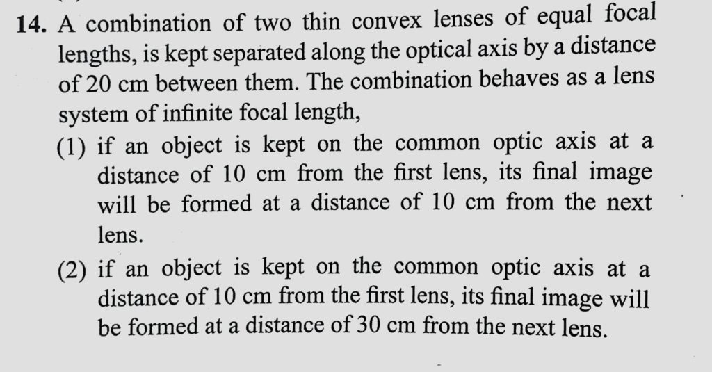 A combination of two thin convex lenses of equal focal lengths, is kept separated along the optical axis by a distance of 20 cm between them. The combination behaves as a lens A combination of two thin convex lenses of equal focal lengths is kept separated along the optical axis by a distance of 20 cm between them. The combination behaves as a lens October 9, 2020 Category: Uncategorised (JEE Advanced Physics by BM Sharma + GMP Solutions) , Facebook Messenger WhatsApp Share this:TwitterFacebook Related