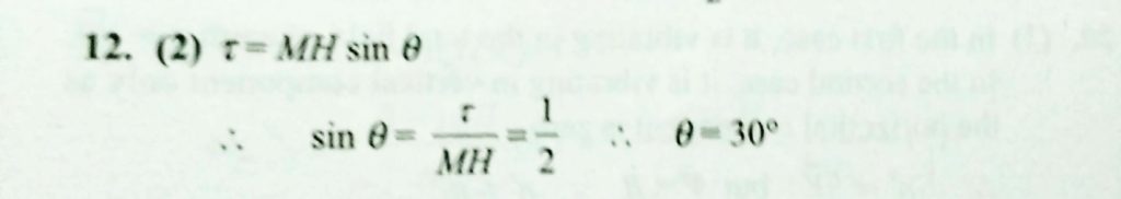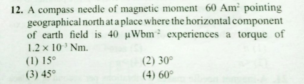 A compass needle whose magnetic moment is 60Am2 points geographic north at a certain place where H = 40μT. The compass needle experience a torque of 1⋅2 × 10^−3 N/m. A compass needle whose magnetic moment is 60Am2 points geographic north at a certain place where H = 40μT. The compass needle experience a torque of 1⋅2 × 10^−3 N/m. October 18, 2020 Category: Uncategorised (JEE Advanced Physics by BM Sharma + GMP Solutions) , Facebook Messenger WhatsApp Share this:TwitterFacebook Related