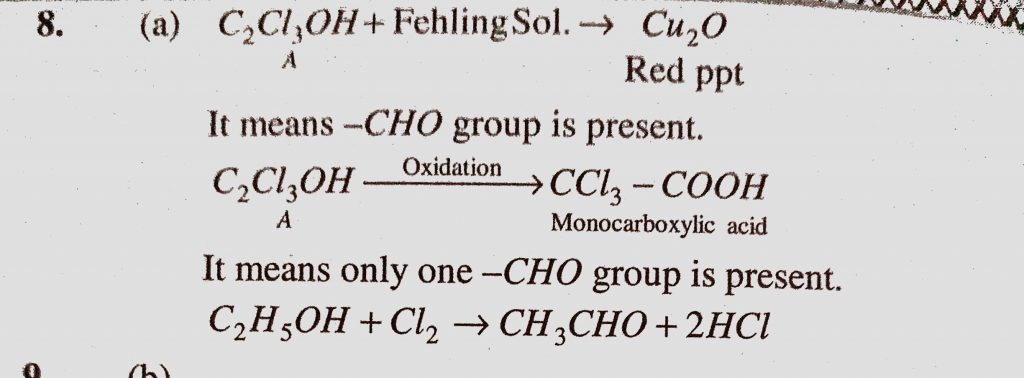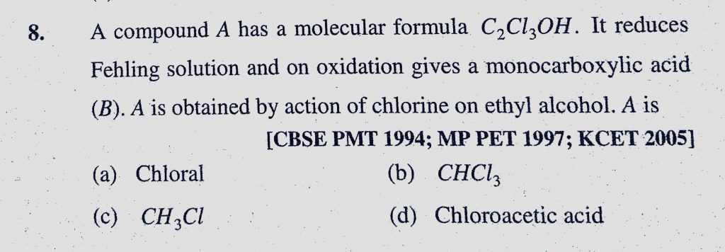 A compound A has a molecular formula C2Cl3OH. It reduces Fehling solution and on oxidation gives a monocarboxylic acid (B). A is obtained by action of chlorine on ethtyl alcohol. A is A compound A has a molecular formula C2Cl3OH. It reduces Fehling solution and on oxidation gives a monocarboxylic acid (B). A is obtained by action of chlorine on ethtyl alcohol. A is December 17, 2020 Category: Uncategorised (JEE Advanced Physics by BM Sharma + GMP Solutions) , Facebook Messenger WhatsApp Share this:TwitterFacebook Related