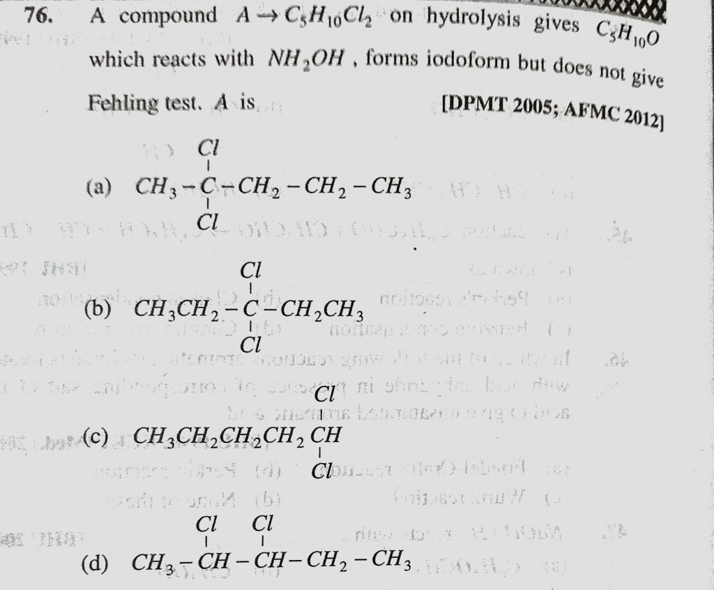 A compound A to C5H10Cl2 on hydrolysis gives C5H10O which reacts with NH2OH, forms iodoform but does not give Fehling test. A is A compound A to C5H10Cl2 on hydrolysis gives C5H10O which reacts with NH2OH forms iodoform but does not give Fehling test. A is February 12, 2021 Category: Uncategorised (JEE Advanced Physics by BM Sharma + GMP Solutions) , Facebook Messenger WhatsApp Share this:TwitterFacebook Related