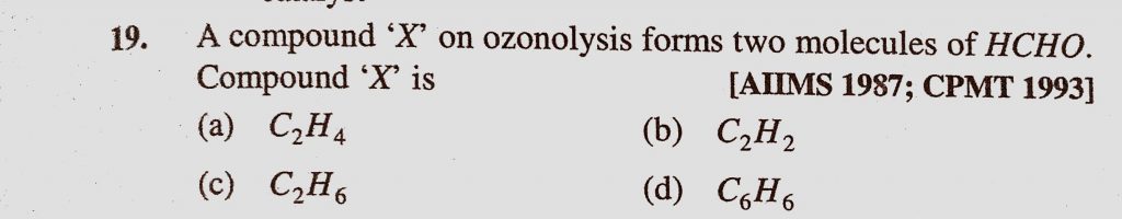 A compound X on ozonolysis forms two molecules of HCHO compound X is (a) C2H4 (b) C2H2 (c) C2H6 (d) C6H6 A compound X on ozonolysis forms two molecules of HCHO compound X is (a) C2H4 (b) C2H2 (c) C2H6 (d) C6H6 December 13, 2020 Category: Uncategorised (JEE Advanced Physics by BM Sharma + GMP Solutions) , Facebook Messenger WhatsApp Share this:TwitterFacebook Related