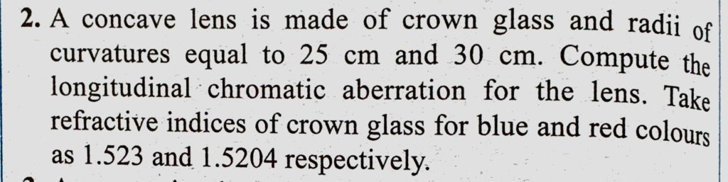 A concave lens is made of crown glass and radii of curvatures equal to 25 cm and 30 cm. Compute the longitudinal chromatic aberration for the lens. Take refractive indices of crown A concave lens is made of crown glass and radii of curvatures equal to 25 cm and 30 cm. Compute the longitudinal chromatic aberration for the lens. Take refractive indices of crown October 8, 2020 Category: Uncategorised (JEE Advanced Physics by BM Sharma + GMP Solutions) , Facebook Messenger WhatsApp Share this:TwitterFacebook Related