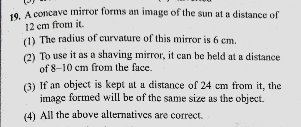 A concave mirror forms an image of the sun at a distance of 12 cm from it. (1) The radius of curvature of this mirror is 6 cm. A concave mirror forms an image of the sun at a distance of 12 cm from it. (1) The radius of curvature of this mirror is 6 cm. October 7, 2020 Category: Uncategorised (JEE Advanced Physics by BM Sharma + GMP Solutions) , Facebook Messenger WhatsApp Share this:TwitterFacebook Related