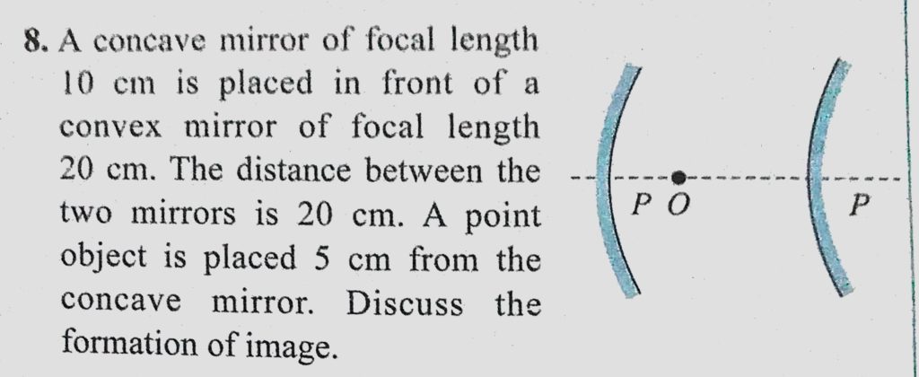 A concave mirror of focal length 10 cm is placed in front of a convex mirror of focal length 20 cm. The distance between the two mirrors is 20 cm. A point object is placed 5 cm from the A concave mirror of focal length 10 cm is placed in front of a convex mirror of focal length 20 cm. The distance between the two mirrors is 20 cm. A point object is placed 5 cm from the October 5, 2020 Category: Uncategorised (JEE Advanced Physics by BM Sharma + GMP Solutions) , Facebook Messenger WhatsApp Share this:TwitterFacebook Related