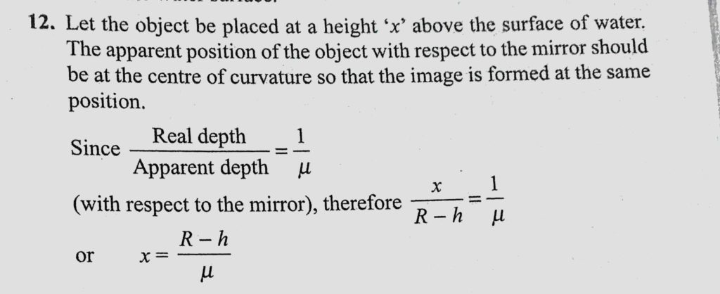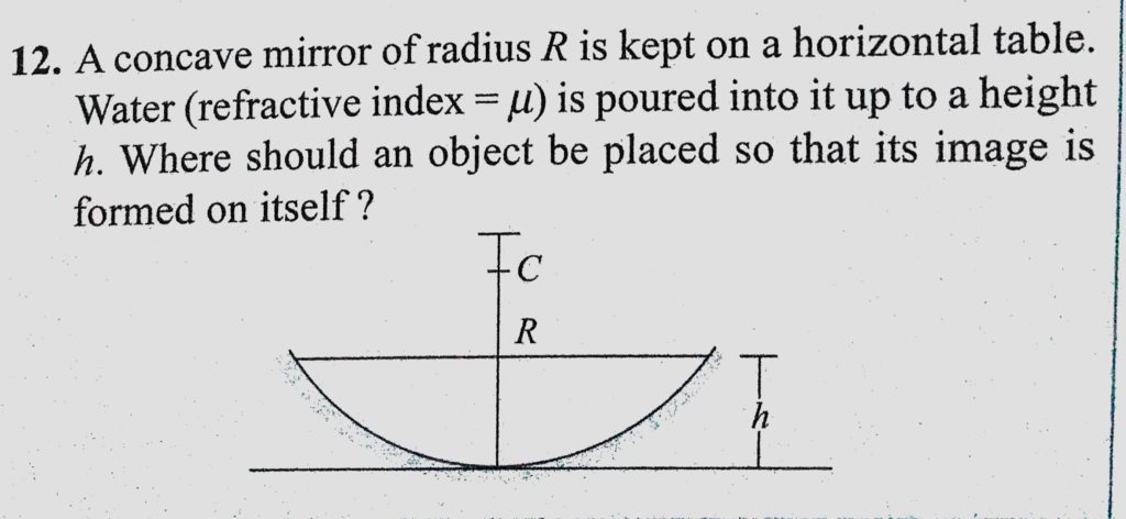 A concave mirror of radius R is kept on a horizontal table. Water (refractive index = mu) is poured into it up to a height h. Where should an object be placed so that its image is formed on itself? A concave mirror of radius R is kept on a horizontal table. Water (refractive index = mu) is poured into it up to a height h. Where should an object be placed so that its image is formed on itself? October 5, 2020 Category: Uncategorised (JEE Advanced Physics by BM Sharma + GMP Solutions) , Facebook Messenger WhatsApp Share this:TwitterFacebook Related