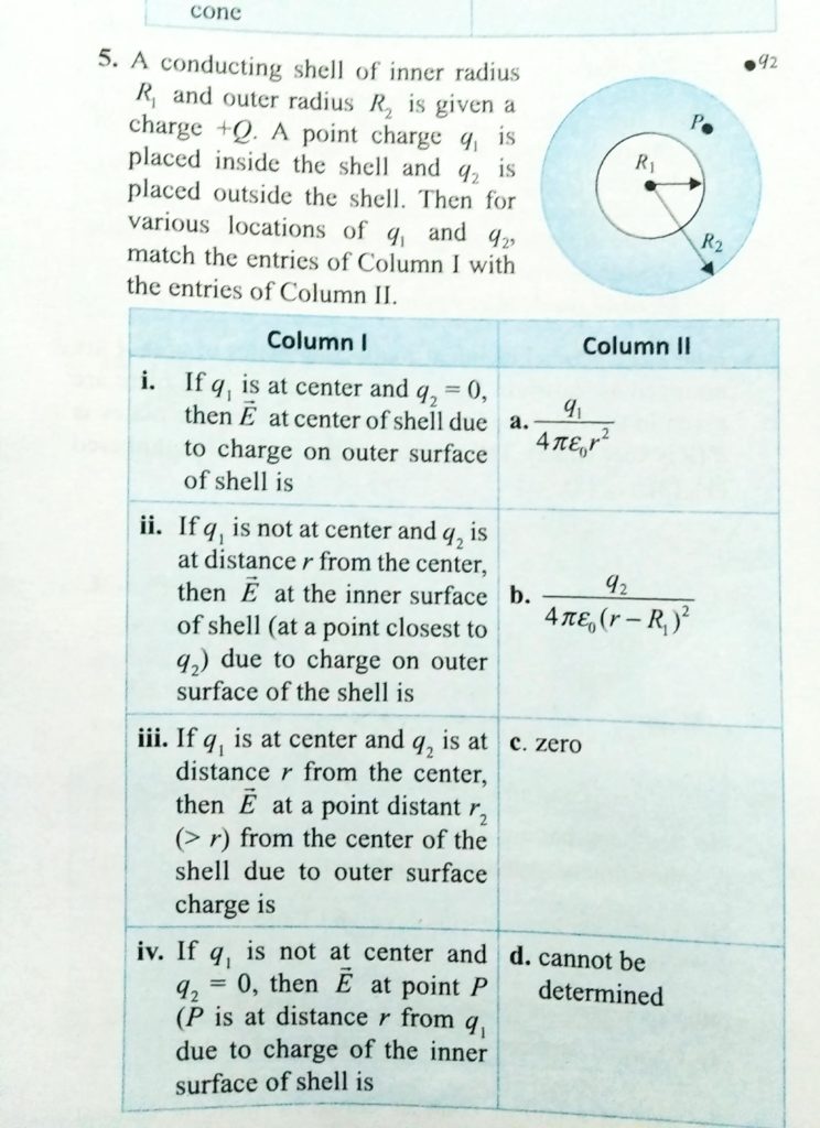 A conducting shell of inner radius R2 is given a charge +Q . A point charge q1 is placed inside the shell and q2 is placed outside the shell. Then for various location of q1 and q2 match the entries of column I with the entries of column II. a charge Q1 is placed a charge Q2 is placed. Inside a neutral spherical shell outside the shell November 1, 2020 Category: Uncategorised (JEE Advanced Physics by BM Sharma + GMP Solutions) , Facebook Messenger WhatsApp Share this:TwitterFacebook Related