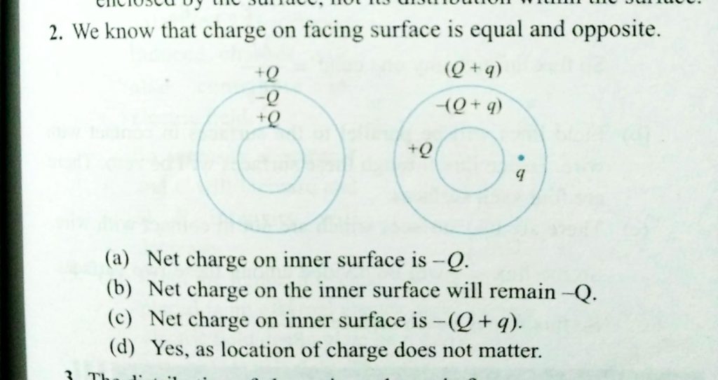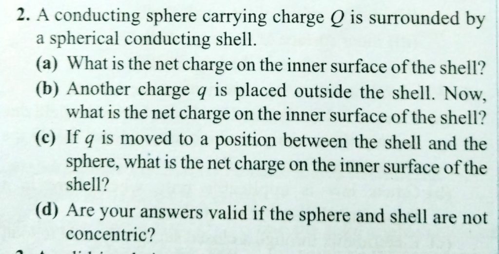 A conducting sphere carrying charge Q is surrounded by a spherical conducting shell. a. What is the net charge on the inner surface of the shell? b. Another charge q is placed outside the shell. Now, what is the net charge on the inner surface of the shell? c. If q is moved to a position between the shell and the sphere, what is the net charge on the inner surface of the shell? d. Are your answer valid if the sphere and shell are not concentric?