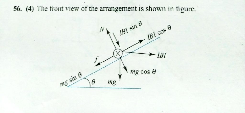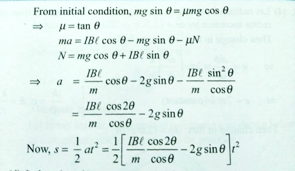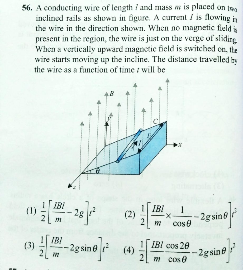 A conducting wire of length `l` and mass `m` is placed on two inclined rails as shown in figure. A current `I` is flowig in the wire in the direction shown When no magnetic field is present in the region, the wire is just on the verge of sliding. When a vertically upward magnetic field is switched on, the wire starts moving up the incline. The distance travelled by the wire as a function of time `t` will be