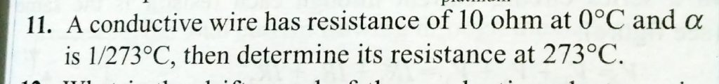 A conductive wire has resistance of 10 ohm at 0 degree C and alpha is 1/273 degree C , then determine its resistance at 273 degree C. A conductive wire has resistance of 10 ohm at 0 degree C and alpha is 1/273 degree C then determine its resistance at 273 degree C. November 10, 2020 Category: Uncategorised (JEE Advanced Physics by BM Sharma + GMP Solutions) , Facebook Messenger WhatsApp Share this:TwitterFacebook Related