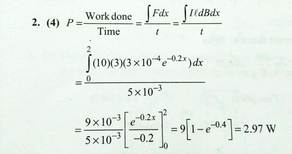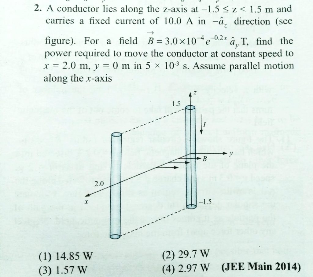 A conductor lies along the z axis at -1.5 < z < 1.5 m and carries a fixed current of 10 A in -az diirection . For a field B = 3.0 x 10 ^-4 e^ -0.2 x ay T, Find the power required to move the conductor at constant speed to x = 2 m , y = 0 m in 5 x 10^-3 s. Assume parallel motion along the x – axis.