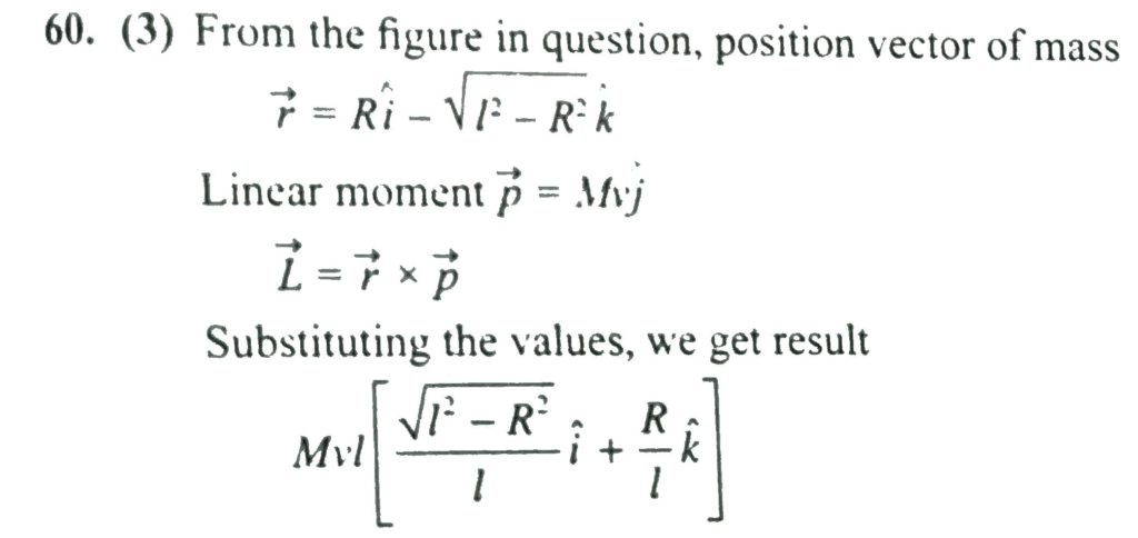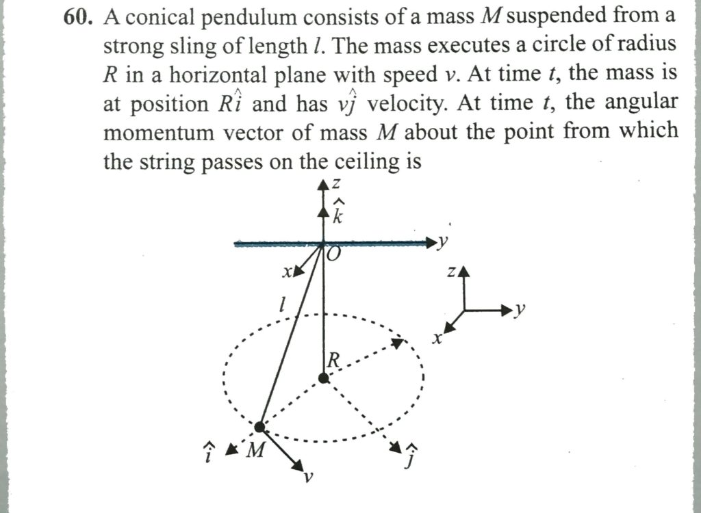 A conical pendulum consists of a mass M suspended from a strong sling of length l. The mass executes a circle of radius R in a horizontal plane with speed v. At time t, the mass is at position R i ^ and has v j ^ velocity. At time t, the angular momentum vector of mass M about the point from which the string passes on the ceiling is