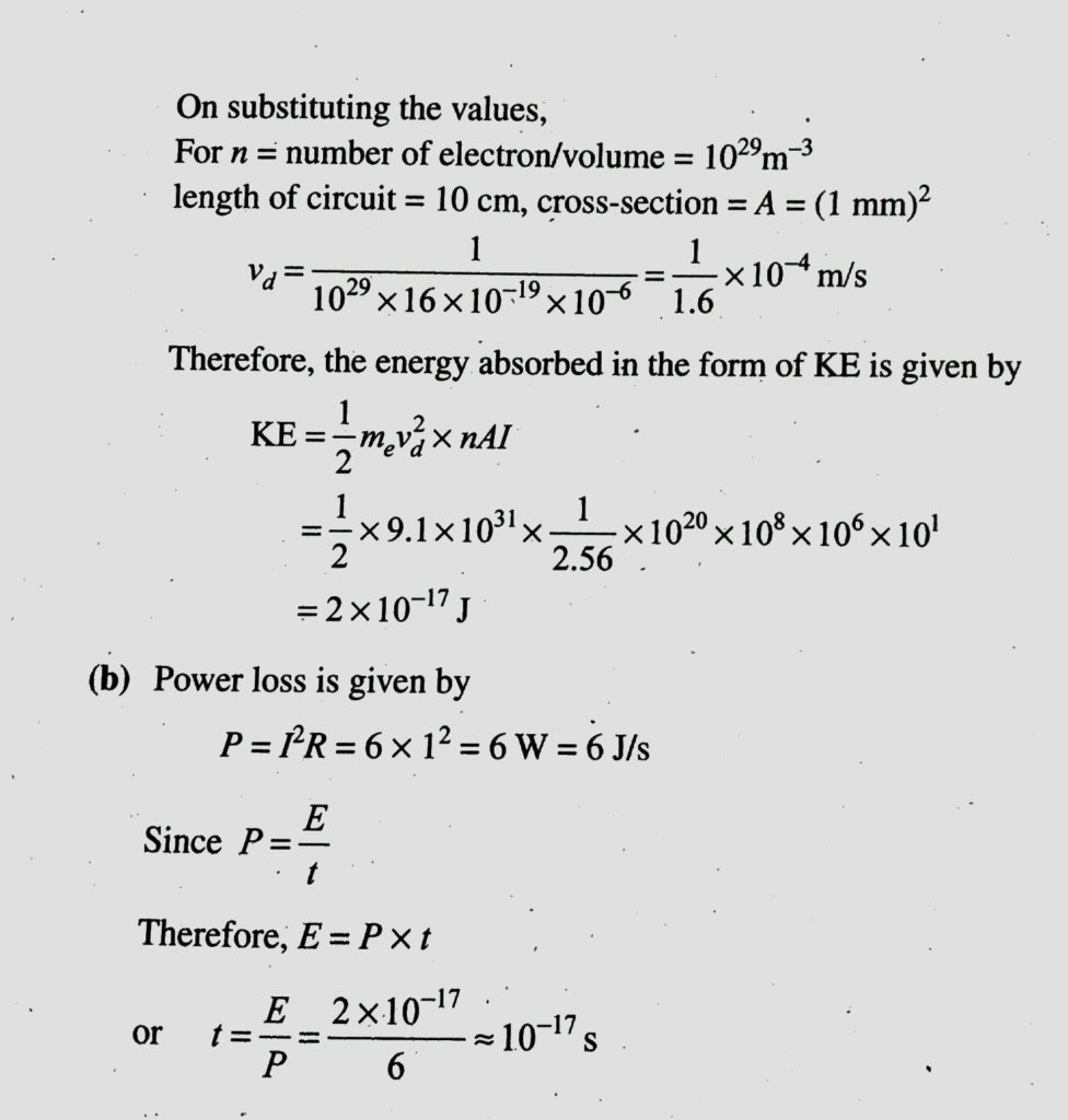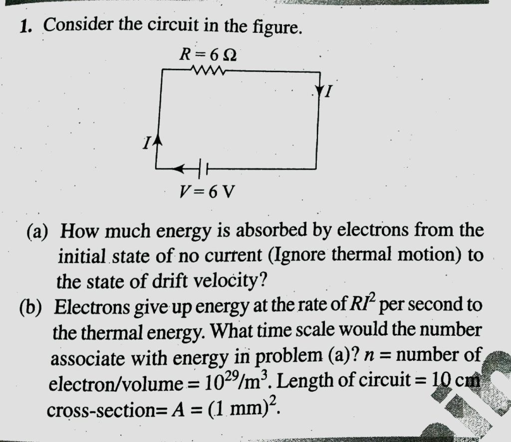 (A) Consider circuit in figure. How much energy is absorbed by electrons from the initial state of no current (Ignore thermal motion) to the state of drift velocity? (b) electrons give up energy at the rate of RI2 per second tot he thermal energy. What time scale would number associate with energy in problem (a)? n= number of electron/volume = 10^29 m^3 length of circuit=10 cm, cross-section A=(1 mm )2
