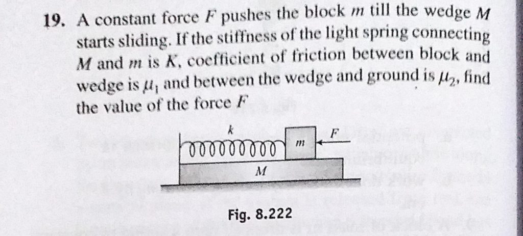 A constant force F pushes the block m till the wedge M starts sliding. If the stiffness of the light spring connecting M and m is K, coefficient of friction between block and wedge is mu 1 A constant force F pushes the block m till the wedge M starts sliding. If the stiffness of the light spring connecting M and m is K coefficient of friction between block and wedge is mu 1 October 3, 2020 Category: Uncategorised (JEE Advanced Physics by BM Sharma + GMP Solutions) , Facebook Messenger WhatsApp Share this:TwitterFacebook Related